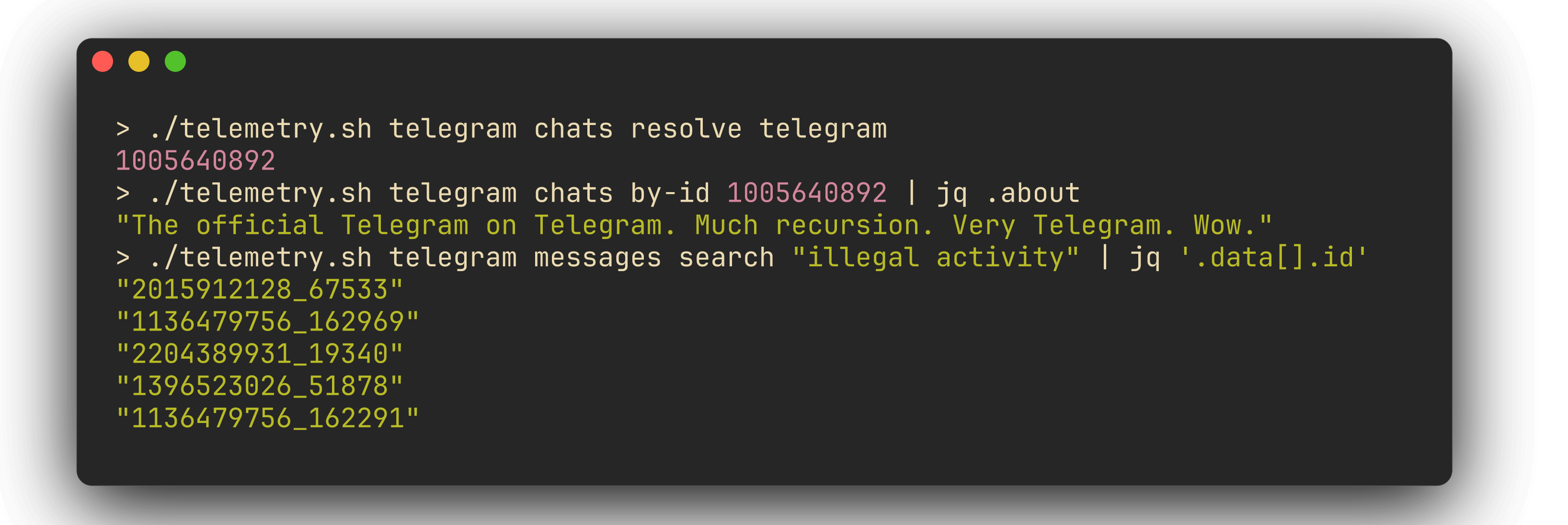 That’s why we’re so proud to launch Telemetry.sh, our new CLI tool enabling you to query Telegram from your terminal. Running Claude Code and want to integrate Telegram data? No problem, just point it towards Telemetry.sh and have at it. Want to automate your workflows yourself? Just as doable.